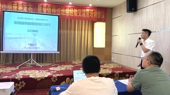 武漢市政院“拾光隧道QC小組”組員龍凡對(duì)“地鐵隧道穿越極硬巖的新方案研究”課題進(jìn)行了成果發(fā)布。“拾光隧道QC小組”為解決地鐵隧道穿越極硬巖傳統(tǒng)方法安全難以保證、工作效率較低等痛點(diǎn)問題,研發(fā)了一種地鐵隧道穿越極硬巖的全新技術(shù)方案,攻克了復(fù)雜地質(zhì)和敏感環(huán)境兩大難題。該研究成果在“武漢地鐵12號(hào)線港口村站~丁家咀站區(qū)間隧道工程”中,實(shí)現(xiàn)盾構(gòu)穿越極硬巖深孔爆破預(yù)處理在武漢軌道交通地下區(qū)間的首次應(yīng)用。“拾光隧道QC小組”對(duì)該創(chuàng)新成果進(jìn)行了標(biāo)準(zhǔn)化建設(shè),形成了通用設(shè)計(jì)圖和成套技術(shù)方案,現(xiàn)已在全公司推廣應(yīng)用。