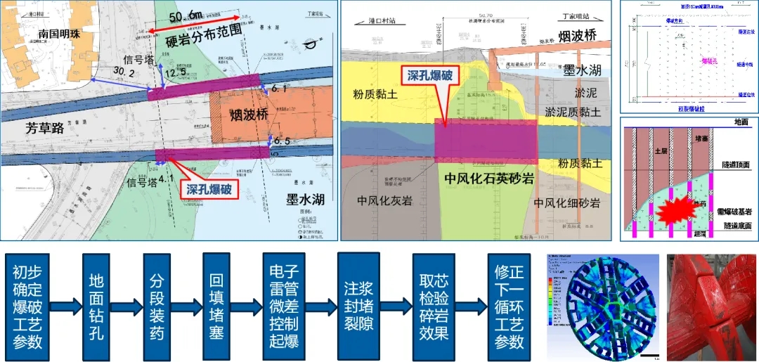 獲獎(jiǎng)項(xiàng)目《地鐵隧道穿越極硬巖的新方法研究》是依托于武漢地鐵12號線港口村站至丁家咀站區(qū)間隧道工程。本項(xiàng)目存在隧道水下穿越強(qiáng)度高達(dá)251MPa極硬巖的復(fù)雜地質(zhì)和周邊有橋梁、建筑等敏感環(huán)境兩大難題,實(shí)驗(yàn)團(tuán)隊(duì)歷經(jīng)近兩年的方案研究和工程實(shí)踐,創(chuàng)新性地提出了解決方案:采用控制爆破技術(shù)對極硬巖進(jìn)行預(yù)處理,有效降低盾構(gòu)機(jī)掘進(jìn)的難度,同時(shí)在爆破過程中采取相應(yīng)的減隔震技術(shù),保障周邊橋梁、房屋和市政管線等建構(gòu)筑物的安全。這一新技術(shù)極大地降低盾構(gòu)機(jī)掘進(jìn)通過極硬巖的難度,提高了施工效率,大幅減少了工程成本,實(shí)現(xiàn)了良好的社會(huì)和經(jīng)濟(jì)效益。