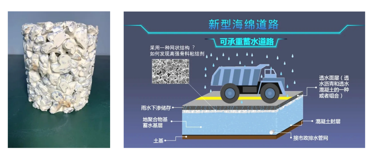 本次獲獎(jiǎng)的《海綿城市可承重蓄水道路材料研發(fā)》科研項(xiàng)目打破了傳統(tǒng)的要求道路基層嚴(yán)格防水的固有思維局限,首次且極具創(chuàng)造性地提出了利用高空隙率的道路基層作為蓄水空間的可承重蓄水道路的新理念。依照這種新的理念,項(xiàng)目團(tuán)隊(duì)制定了嶄新的研究思路并成功開發(fā)出了一種具有高強(qiáng)度、高粘結(jié)特性的新型地聚合物凝膠材料,利用該凝膠材料包覆開級(jí)配骨料表面能夠?qū)⒋止橇侠喂痰卣辰Y(jié)在一起,可形成具備高強(qiáng)度和高空隙率的蜂窩狀空間結(jié)構(gòu)凝聚體路基材料,從而能夠在保證路基結(jié)構(gòu)整體強(qiáng)度的同時(shí),實(shí)現(xiàn)高效的道路基層蓄水功能,有利于緩解城市內(nèi)澇,達(dá)到海綿城市可承重蓄水道路建設(shè)的要求,同時(shí)也為大幅提升城市地下空間有效利用率提供了新的可能性。在該項(xiàng)目開展成果評(píng)價(jià)時(shí),評(píng)價(jià)專家委員會(huì)也一致認(rèn)為項(xiàng)目研究成果達(dá)到了國內(nèi)領(lǐng)先水平。