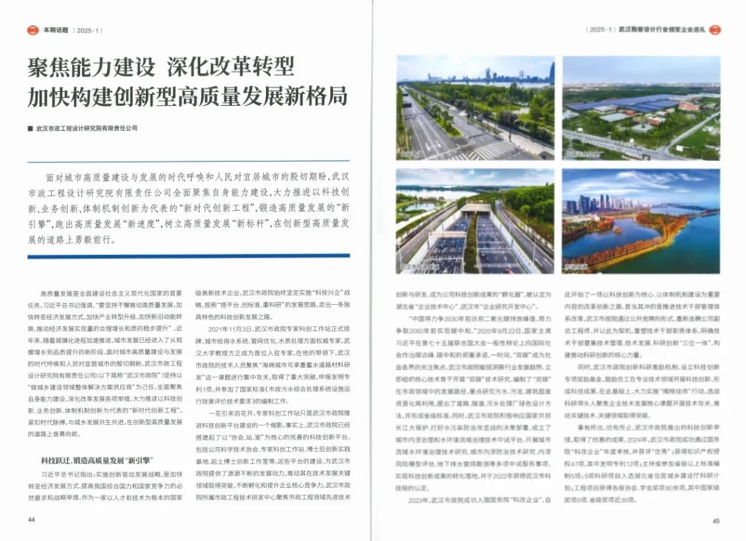 ? ? 近日,行業(yè)權(quán)威期刊《中國勘察設(shè)計》聚焦武漢勘察設(shè)計行業(yè),對領(lǐng)軍企業(yè)進(jìn)行了專題報道。其中,武漢市政工程設(shè)計研究院有限責(zé)任公司(以下簡稱“武漢市政院”)以“聚焦能力建設(shè),深化改革轉(zhuǎn)型,加快構(gòu)建創(chuàng)新型高質(zhì)量發(fā)展新格局”為主題,分享了其在新時代背景下的創(chuàng)新實踐和發(fā)展成果,展示了企業(yè)在高質(zhì)量發(fā)展道路上勇毅前行的風(fēng)采和活力,引發(fā)了行業(yè)廣泛關(guān)注。