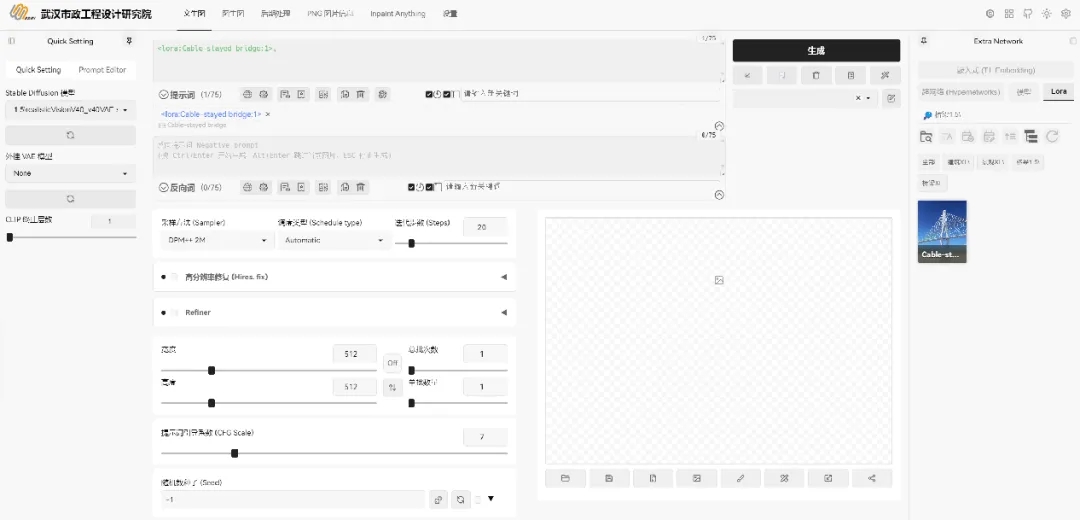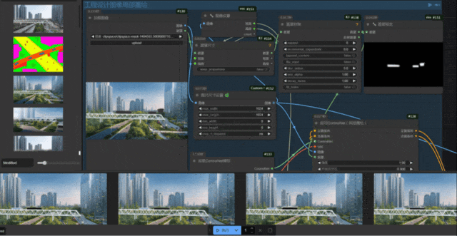 ? ? 武漢市政院在 AIGC 生成效果圖方案領(lǐng)域,通過深度學(xué)習(xí)算法優(yōu)化與專業(yè)圖像數(shù)據(jù)訓(xùn)練,搭建了市政工程效果圖方案自動化生成平臺1.0版,構(gòu)建了路橋、建筑等專業(yè)圖像生成大模型的模型庫。平臺通過引入DeepSeek-R1 等前沿大語言模型,借助其強大的深度語義理解機制與多模態(tài)認(rèn)知能力,可解構(gòu)模糊設(shè)計意圖,自動生成符合工程規(guī)范與藝術(shù)審美的精準(zhǔn)提示詞,突破傳統(tǒng)人工描述的主觀性與局限性;同時,依托自定義節(jié)點技術(shù),成功開發(fā)并驗證了多套一鍵生成效果圖的高效工作流,為設(shè)計團隊提供了豐富的靈感和多元化的選擇。