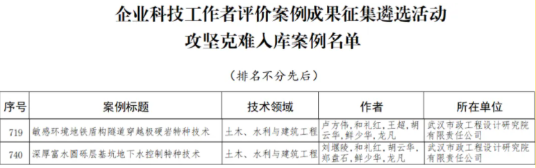 ? ? ?2025年6月4日,中國科協(xié)發(fā)布了《關于企業(yè)科技工作者評價案例成果征集遴選活動結果的通知》,公布了《企業(yè)科技工作者評價案例庫》,其中攻堅克難案例843項、成果轉化案例726項。武漢市政院巖土博士創(chuàng)新工作室申報的“敏感環(huán)境地鐵盾構隧道穿越極硬巖特種技術”、“深厚富水圓礫層基坑地下水控制特種技術”兩項攻堅克難案例與技術均成功入庫。