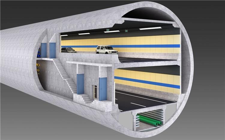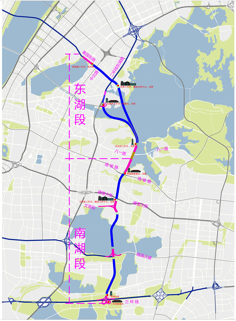 兩湖隧道工程北接秦園路和東湖路,南連三環(huán)線,分為東湖段、南湖段,全長(zhǎng)約19公里。兩湖隧道采用“隧-路-隧”的總體建設(shè)方式,隧道內(nèi)設(shè)計(jì)為上、下兩層,分別行駛不同方向的車輛,節(jié)約了用地、減少拆遷成本。南湖段盾構(gòu)直徑為15.5米,超大直徑設(shè)計(jì)居國(guó)內(nèi)之首,是國(guó)內(nèi)最長(zhǎng)、世界規(guī)模最大的城市湖底雙層隧道。