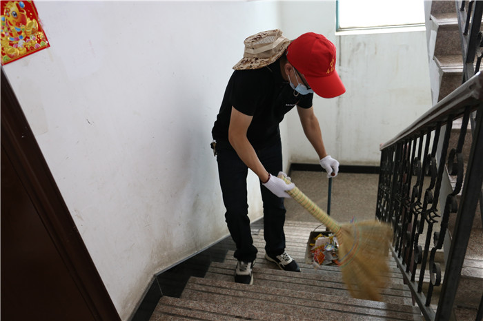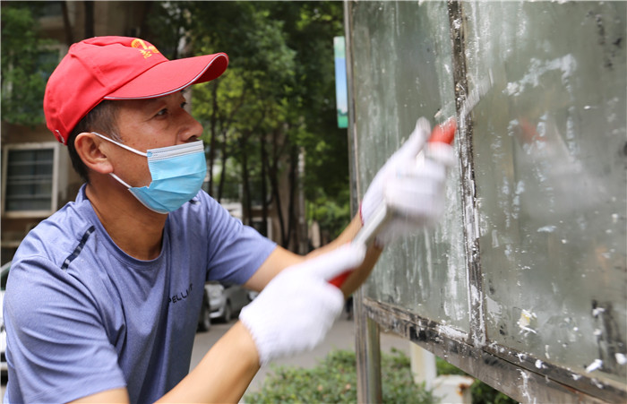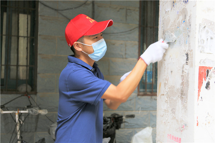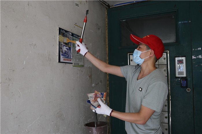 由于該小區(qū)系老舊小區(qū),樓棟內(nèi)沒有電梯,黨員們需要步行逐層進(jìn)行清理,加之暑熱未消,沒過一會(huì)他們的衣服就被汗水浸濕了,額頭上也掛滿了密密的汗珠。但看著煥然一新的房門和墻面,他們的心里也油然生出了滿滿的成就感。