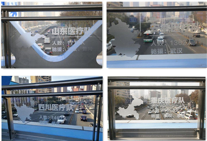 在天橋欄板上鐫刻著馳援湖北的人民解放軍醫(yī)療隊(duì)和30個(gè)省市自治區(qū)醫(yī)療隊(duì)的名稱、人數(shù)、所屬地區(qū)地圖板塊以及支援疫情地區(qū)。時(shí)值湖北武漢抗疫的關(guān)鍵時(shí)刻,全國各地的白衣戰(zhàn)士逆行而上,馳援湖北,為控制疫情、保護(hù)人民的生命安全做出了巨大的貢獻(xiàn),他們的救城之恩銘刻在每一個(gè)湖北人、武漢人的心中。