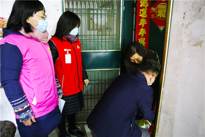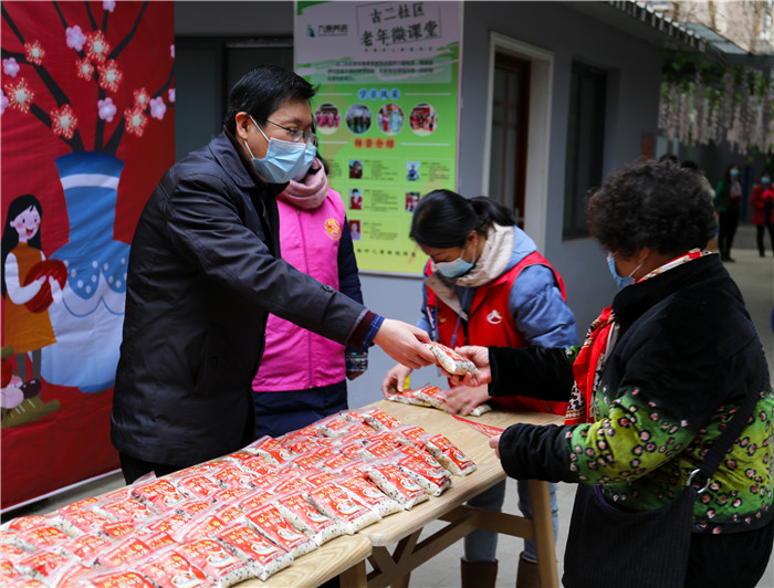 慰問期間,恰逢社區(qū)正在開展“臘八送福·甜蜜相伴”活動,談逢陽一行也加入其中,熱情地為前來的社區(qū)居民發(fā)放臘八米,送上殷切的節(jié)日祝福,叮囑他們要做好防護(hù)。