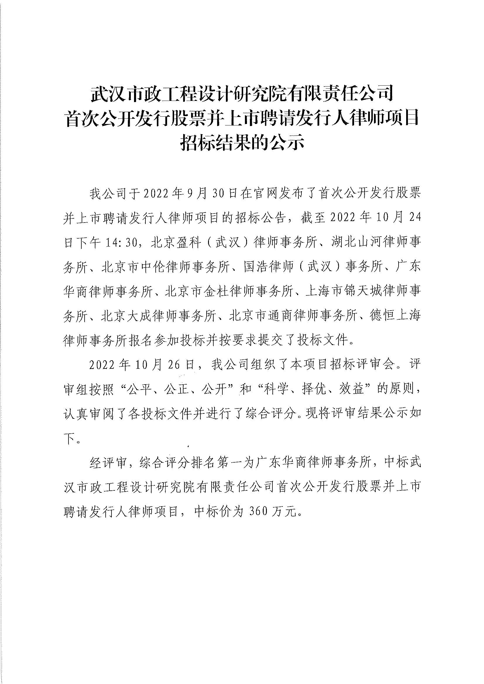 武漢市政工程設(shè)計(jì)研究院有限責(zé)任公司首次公開發(fā)行股票并上市聘請發(fā)行人律師項(xiàng)目招標(biāo)結(jié)果的公示