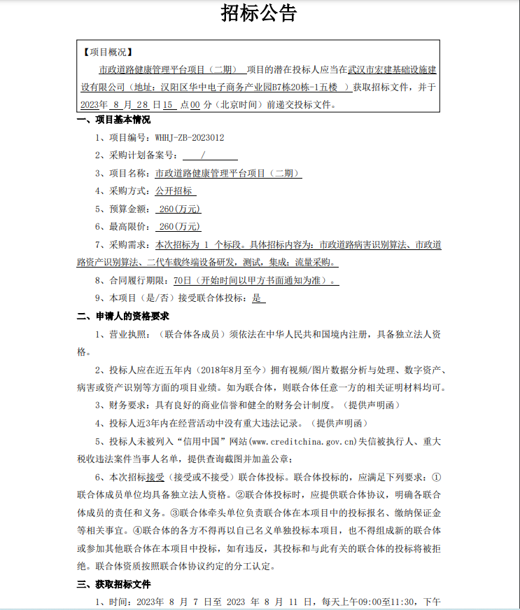 市政道路健康管理平臺項(xiàng)目(二期)招標(biāo)公告
